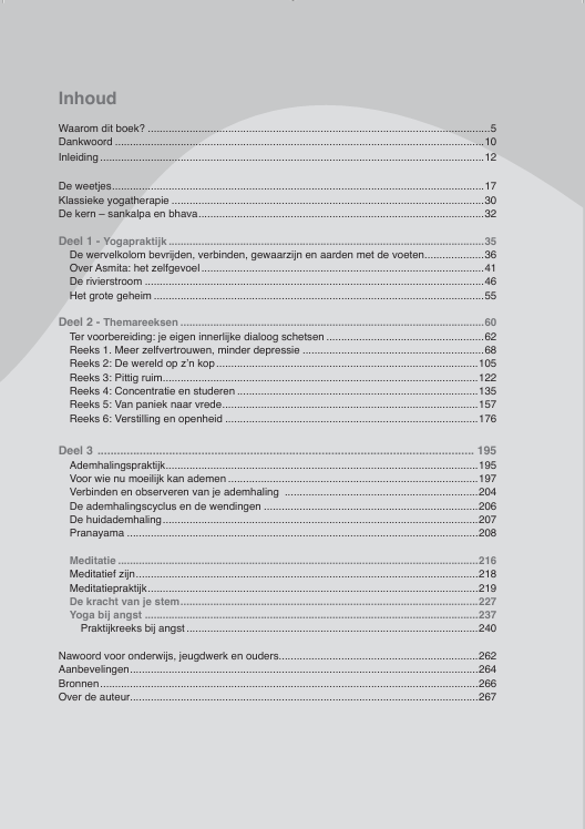 Je vindt er – naast toegankelijke informatie over klassieke yogatherapie en stress – handige themareeksen in terug voor meer zelfvertrouwen-minder depressie, angst, paniek, emotionele regulatie, betere concentratie, verstilling en goed ademen. Ook meditatie en feel-good-meditaties kregen een bijzondere plaats in dit yogapraktijkboek. Het accent binnen deze yogatherapie ligt op een gevoel van bevrijding van lichamelijke en geestelijke spanning. Zich verbonden, veilig, geaard en innerlijk krachtig voelen staat voorop. De yogatechnieken zijn een combinatie van lichaamshoudingen, ademhalingsoefeningen, positief gemoed, meditatie en klanken ‘chanten’.
